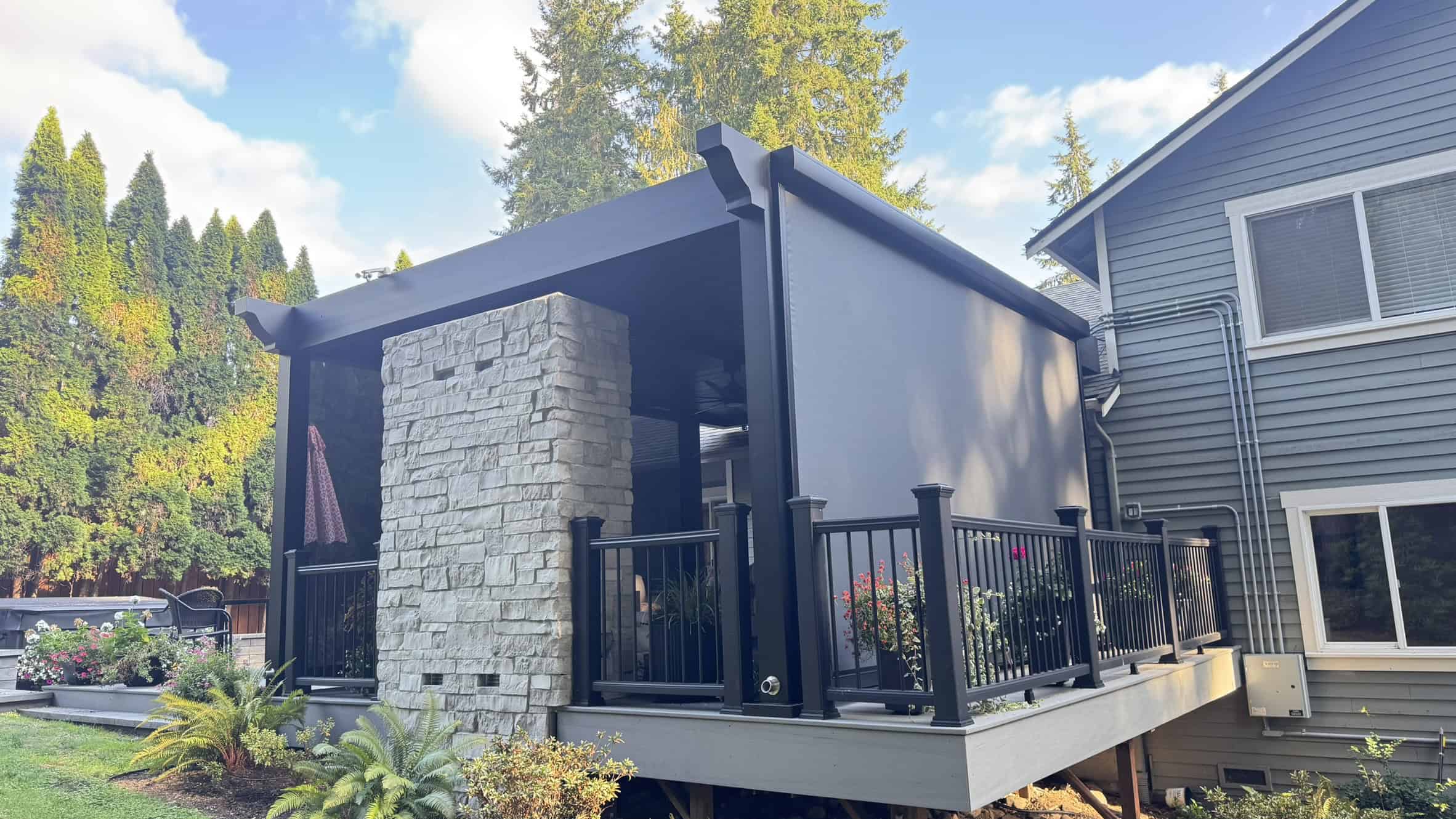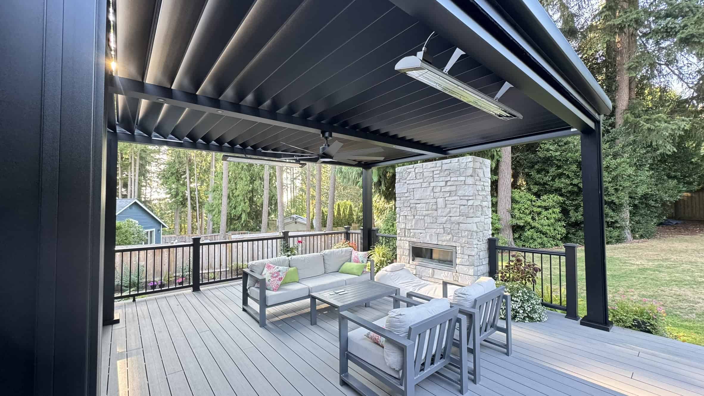 Full Outdoor Transformation (3-D Design and Build including Paver Patio, Retaining Wall, Deck, Railings, Outdoor Fireplace, Smart Aluminum Louvered Pergola, Lights, Heaters, Fans, MagnaTrack Motorized Screens and Landscape Lighting )